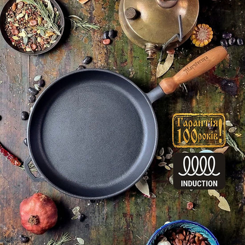 Сковорода Ø26см, глибина 4см, вага 2,8 кг. чавунна з дерев'яною ручкою (Т303)